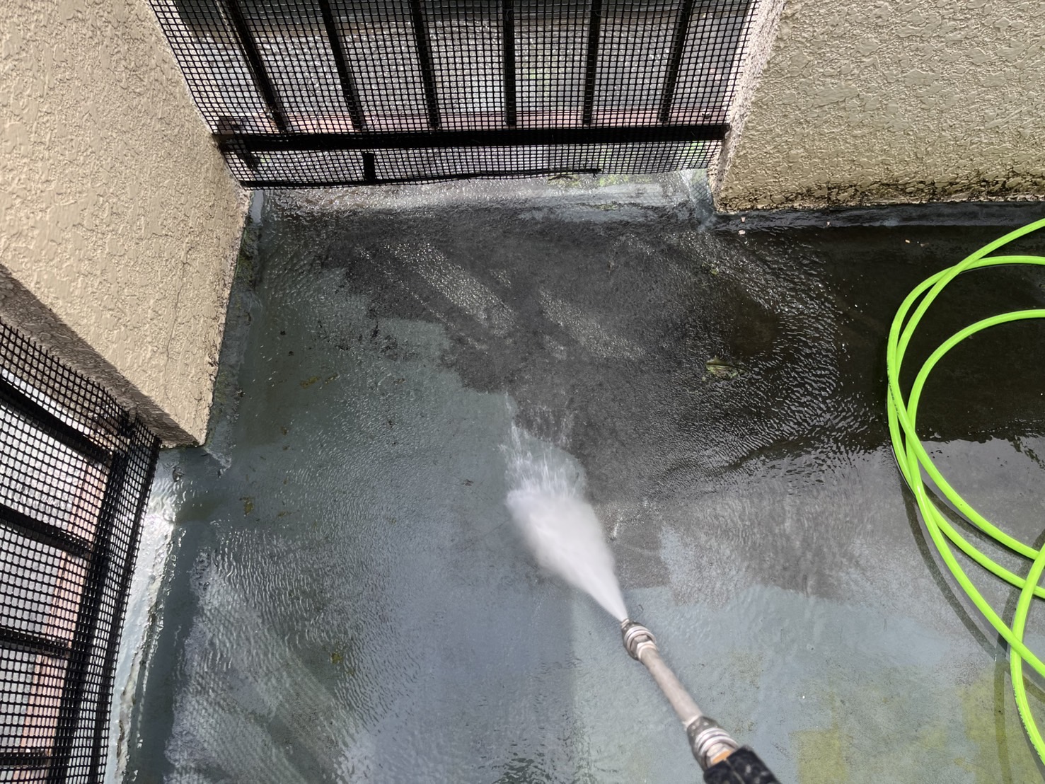 2階バルコニー部分の防水前高圧洗浄を行いました。